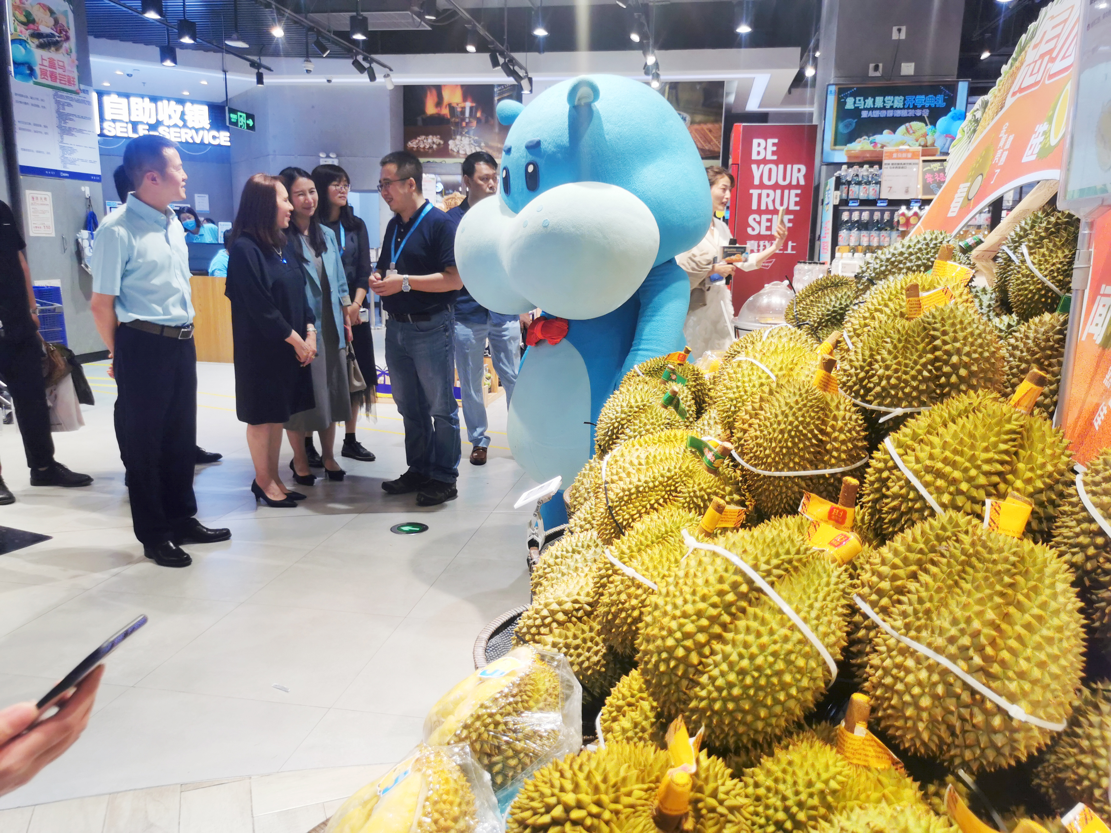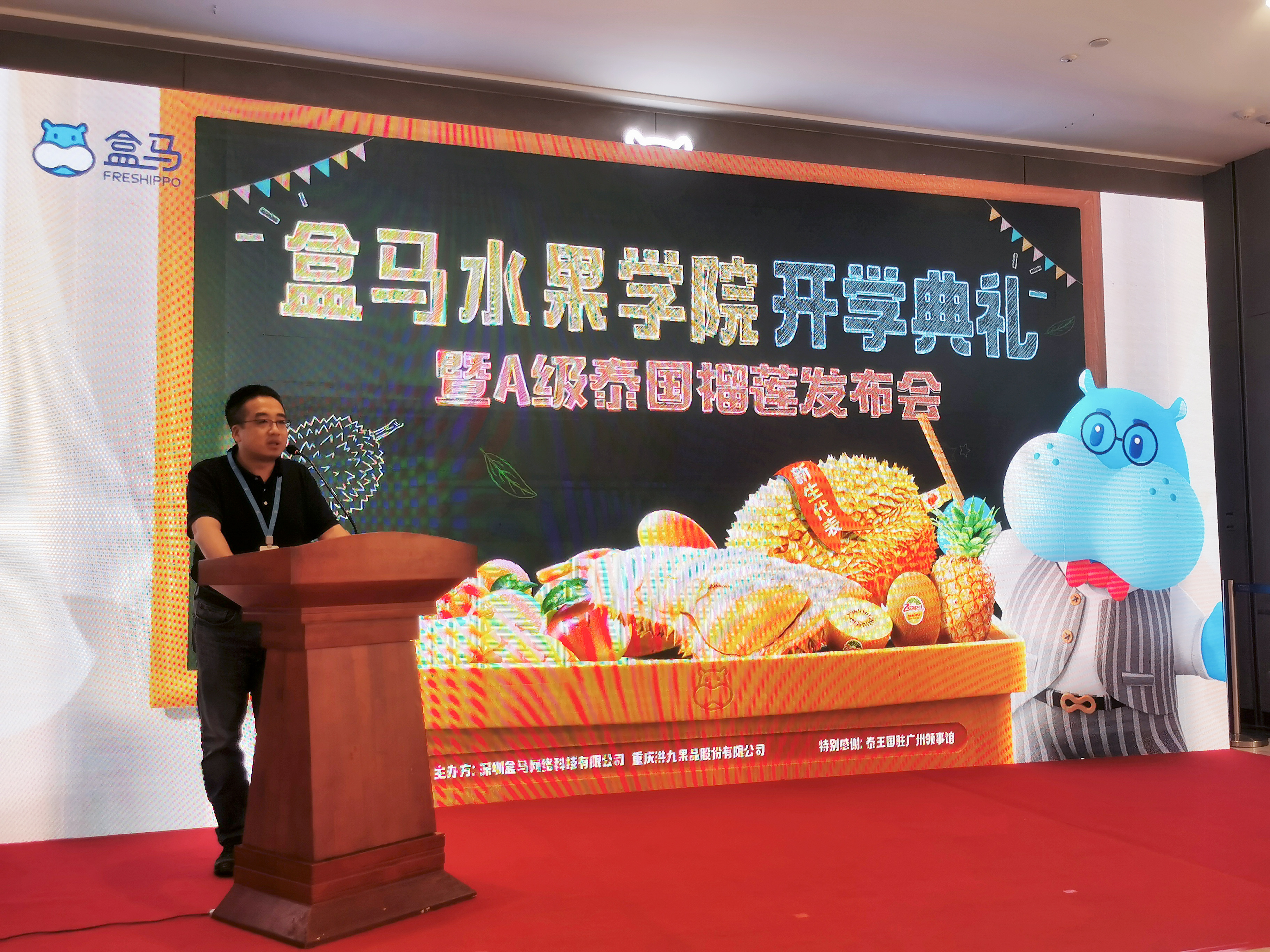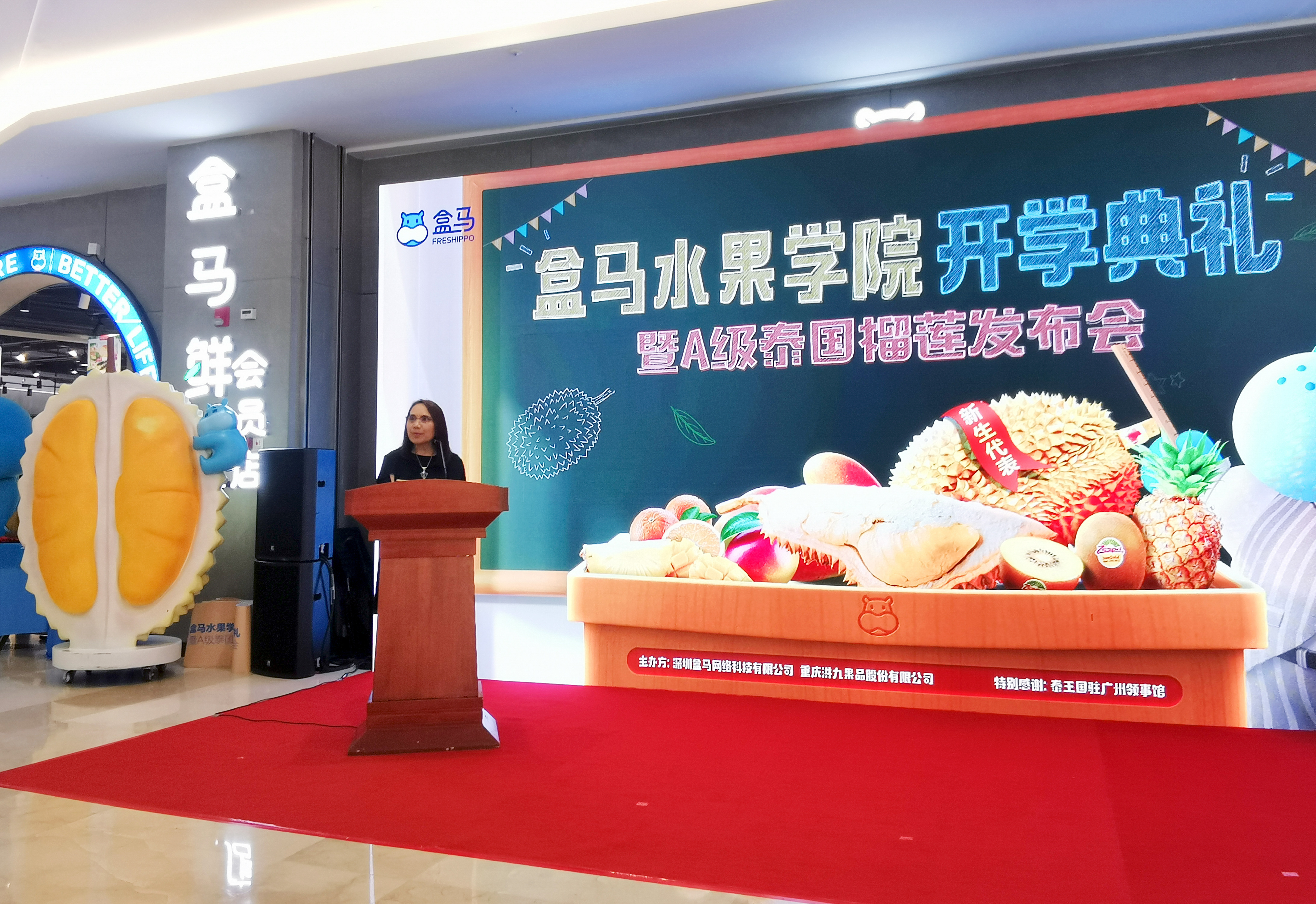 4月2日,盒马水果学院暨纯A泰国榴莲发布会启动仪式在深圳盒马皇庭广场店盛大启动。泰王国驻广州总领事馆商务处商务副领事吴嘉丽女士,洪九果品杨俊文副总经理应邀出席启动大会并发言。
