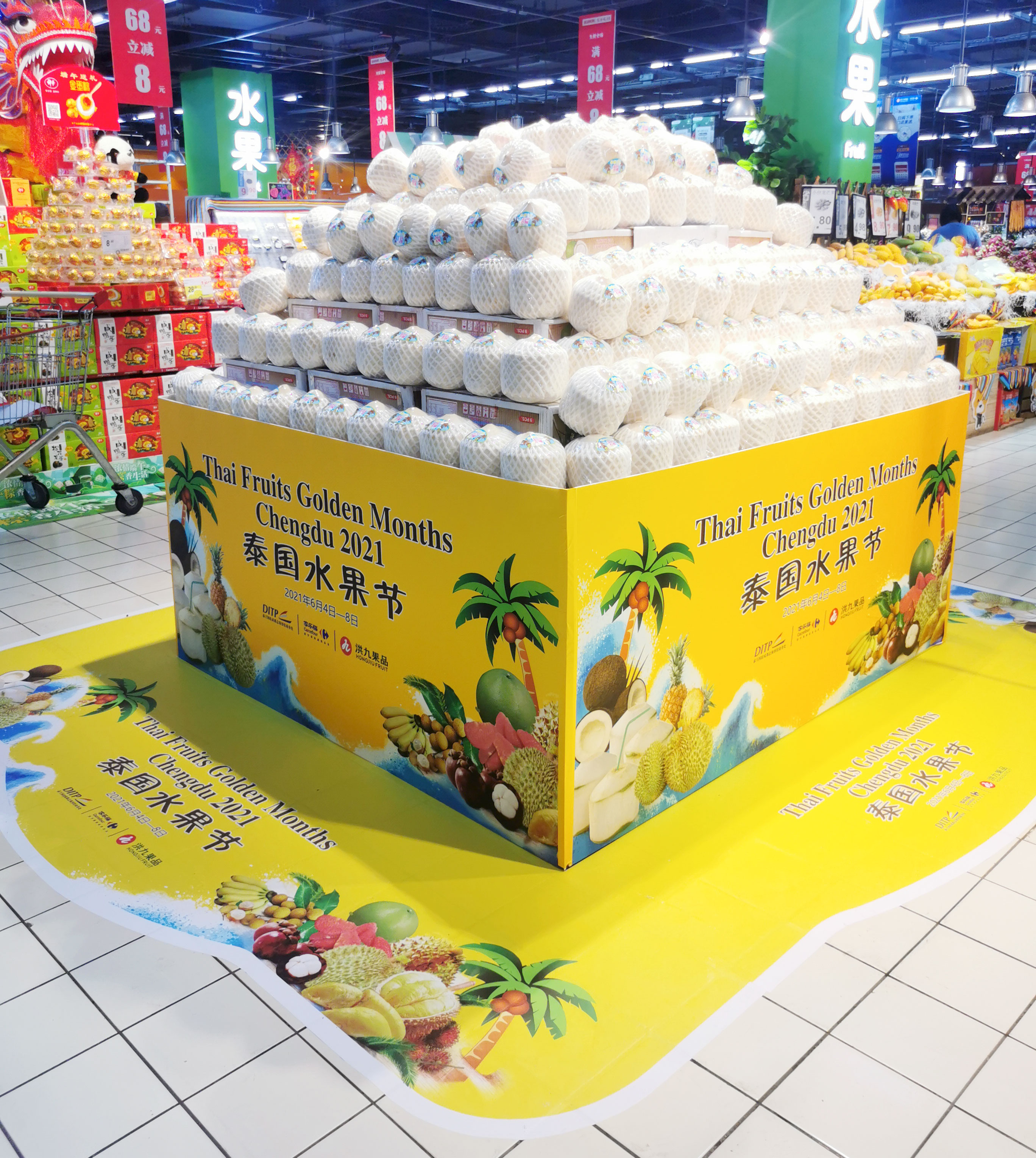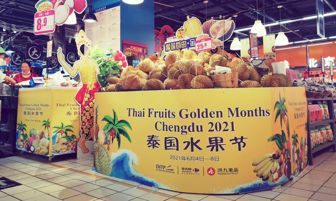 2021年6月4日,由泰王国驻成都总领事馆商务处、成都家乐福和洪九果品联合举办的“泰国水果节”活动火爆来袭!小伙伴们可以在成都家乐福18家门店及家乐福小程序购买下单,活动期间,除了超优惠的价格,还能让你不出国门就能尽享泰国水果盛宴,实现“水果自由”!